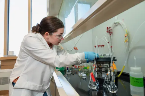 Kylie is performing an extraction to detect the presence of disinfection byproducts in drinking water samples. Disinfection byproducts are a regulated class of carcinogenic chemicals that are formed during water treatment. Treatment plants work to control microbial risk by disinfecting water with chlorine or chloramines, but disinfection byproducts form as a side effect. My work is focused on understanding the formation, speciation, and relative toxicity of these chemicals to inform future regulations and reduce risk from these chemicals at the tap